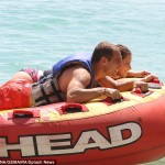 La pareja disfrutó de un viaje en una balsa inflable y pasaron zumbando alrededor de un barco en el mar.