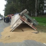 Hoy por la mañana se produjo un accidente en la tristemente famosa curva de Todd, la 2ª en sentido Arrecifes – Viña, en la que un camión con acoplado que transportaba cereal se pasó de largo y volcó, además de obligar a un Volskwagen Gol que venía de frente a tirarse a la banquina.
