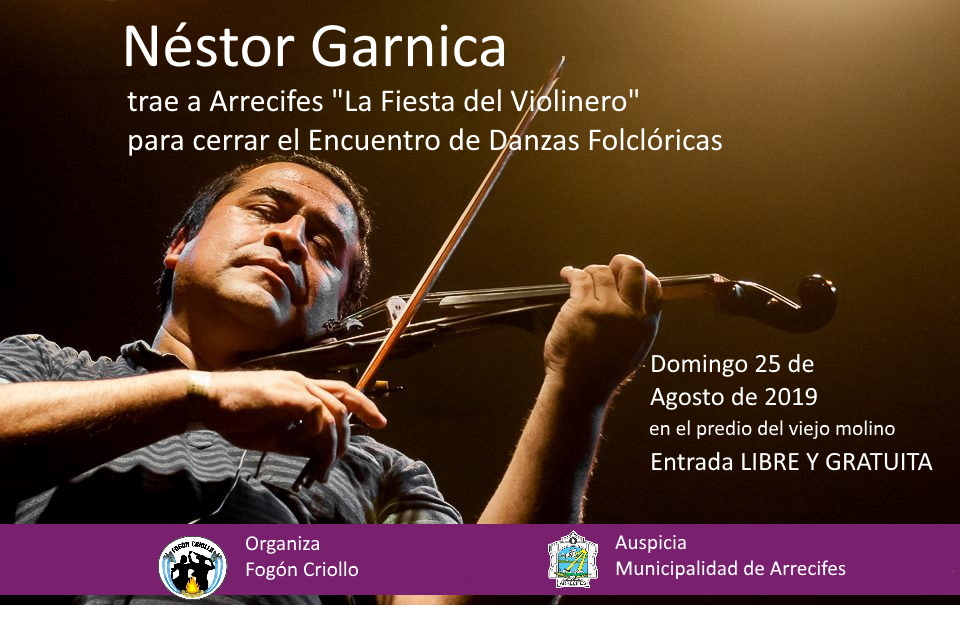 Organizado por la agrupación «Fogón Criollo» de danzas folclóricas que funciona en el Club Argentino y que dirige Susana Chiarcossi, con el auspicio de la Municipalidad de Arrecifes, el próximo 25 se llevará a cabo un acontecimiento único para Arrecifes, cuando abra el primer Encuetro de Danzas Folclóricas, que contará con la presencia del violinista Néstor Garnica, presentando su último trabajo «Fiesta del violinero» .