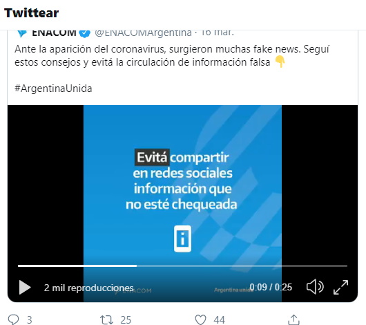 Al respecto, destaca que «Al coronaviurs lo frenamos con información oficial», «Seguí las recomendaciones del Gobierno Nacional para prevenir el virus», «Evitá compartir en redes sociales, información que no esté chequeada», «La difusión de noticias falsas sobre el coronavirus es muy peligrosa, porque impacta en la salud y el bienestar de todos y todas».