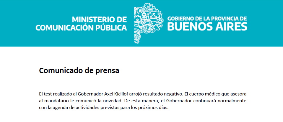 Se conoció el resultado del test hecho al Gobernador Axel Kicillof Comente esta nota comentarios Navegación de entradas El gobernador de la Provincia se sometió al test de coronavirus Coronavirus: 98 nuevos casos en Argentina y 7 fallecidos
