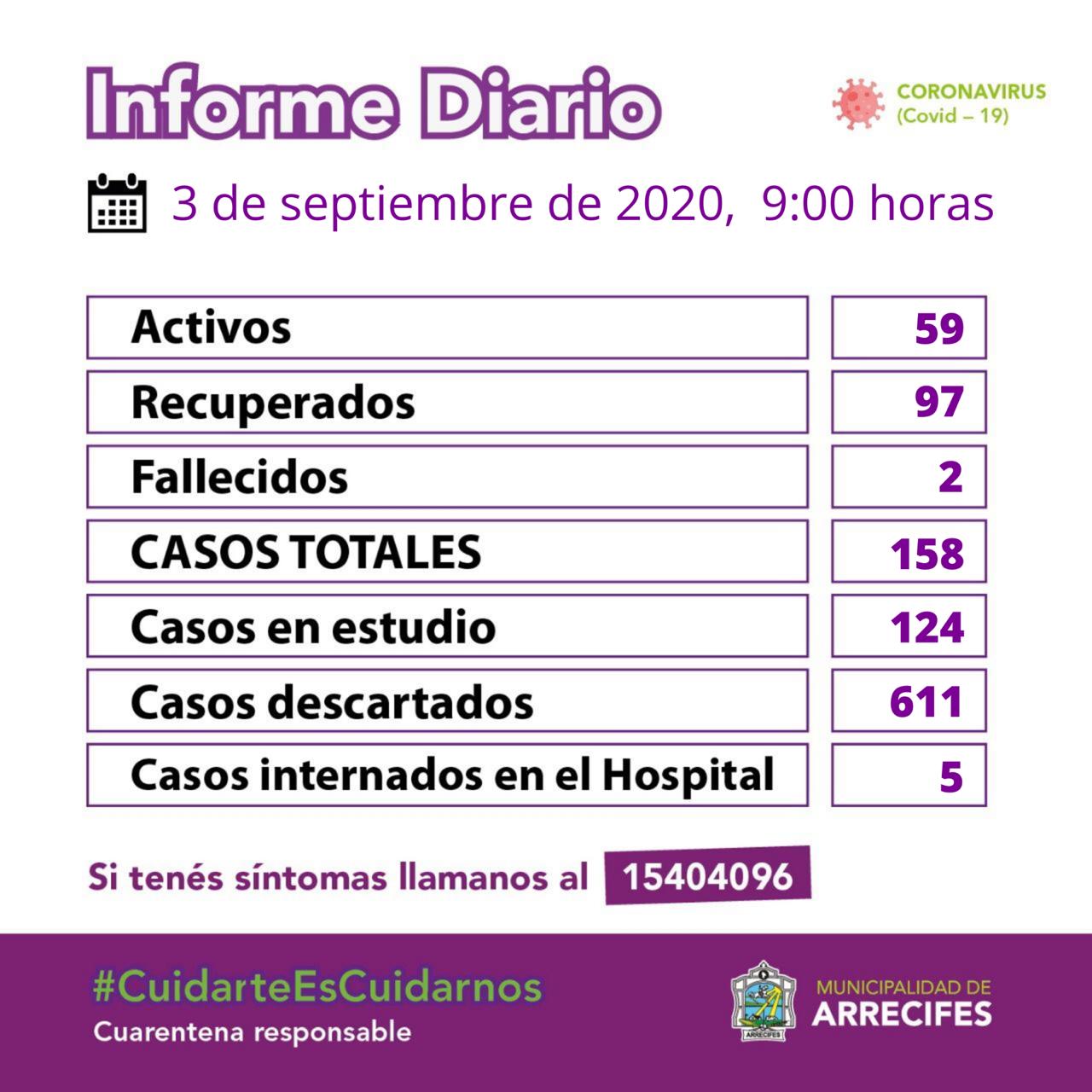 La situación epidemiológica del día 03 de septiembre a las 09:00 horas es la siguiente: