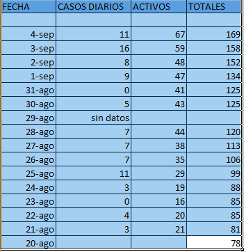 En los últimos quince días, hasta hoy 4 de septiembre, sumamos 91 casos, con lo que el total de casos asciende a 169, superamos el doble. Aunque esto parezca desmesurado, lo que si puede ser preocupante, es que a la vez que se sumaron casos, fue creciendo también la cantidad de casos activos día a día.