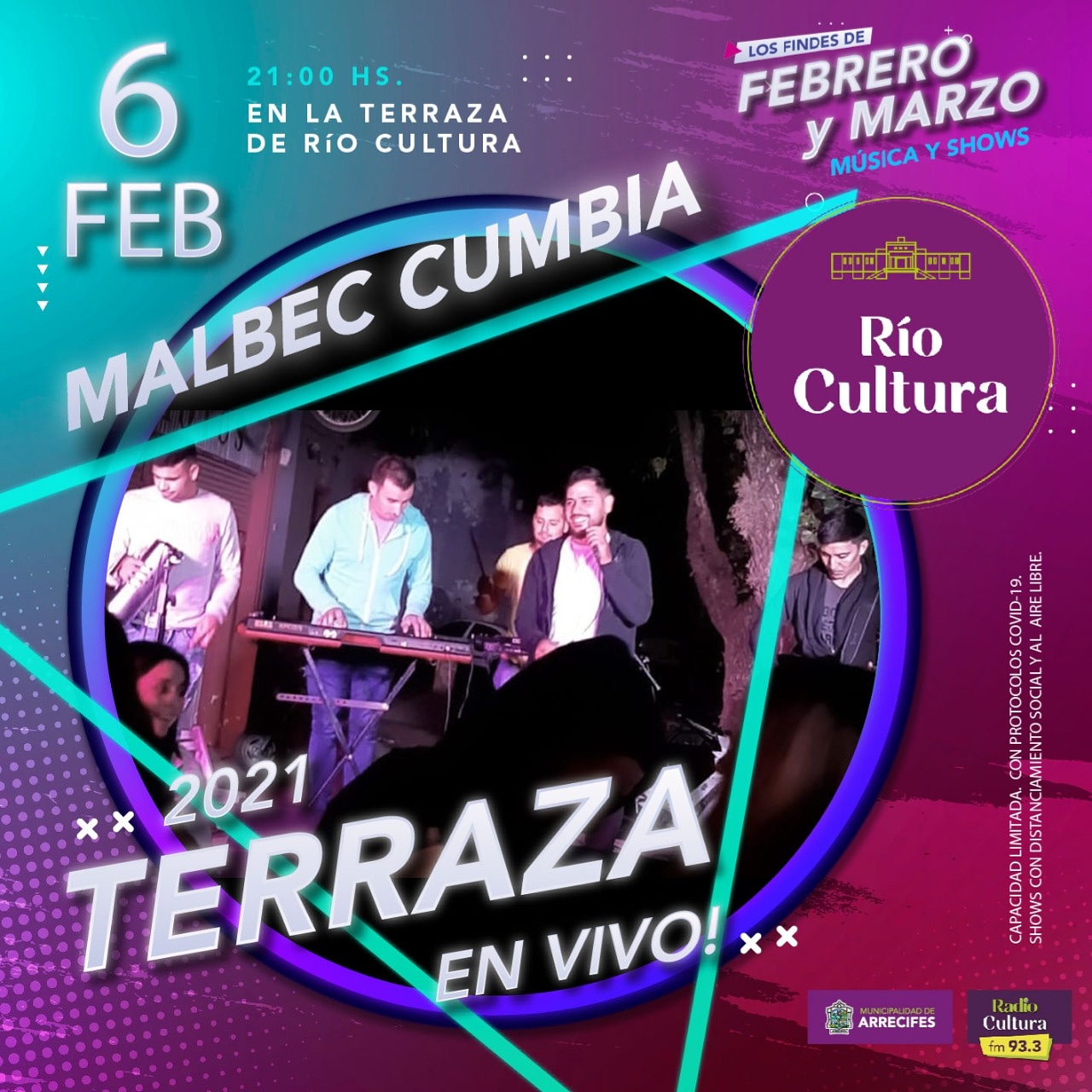 El próximo sábado 6 de febrero a las 21 hs. MALBEC CUMBIA se presenta en la primera jornada del ciclo de música «Terraza en Vivo», organizado por la Municipalidad de Arrecifes, en la terraza del edificio del Balneario Municipal, Río Cultura.