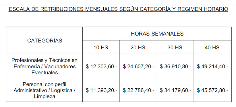 El portal digital tuvo acceso también a documentación de la Provincia en la que se detallan los montos, que van desde $ 12.303,60 a 49.214,40 de acuerdo a la carga horaria de vacunadores eventuales, profesionales y técnicos en enfermería. Mientras que las sumas varían desde $11.393,20 hasta $45.572,80 para las categorías de personal administrativo, logística y limpieza.