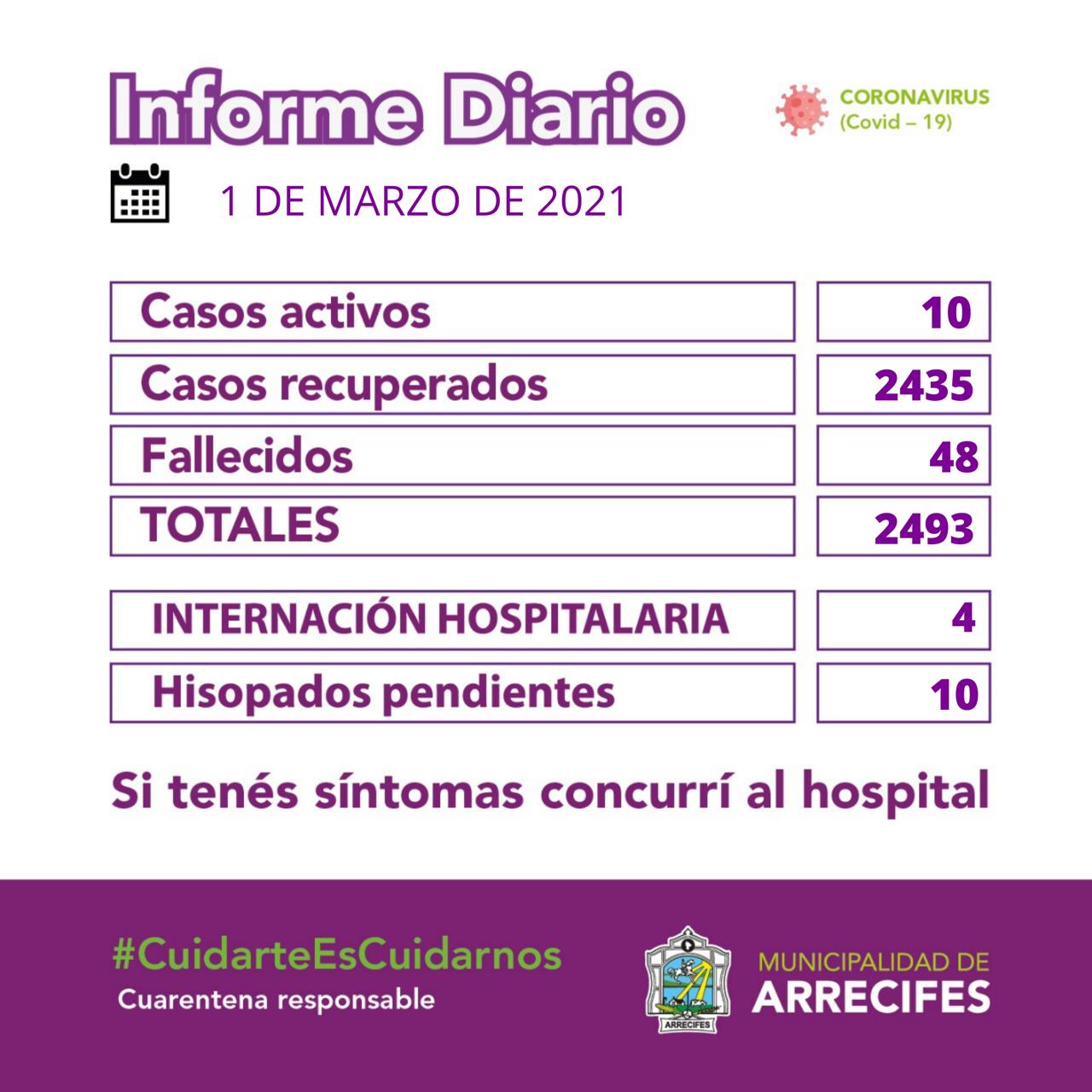 Desde la Secretaría de Salud de la Municipalidad, se difundieron los datos actuales de la situación epidemiológica al día 1 de marzo de 2021 en el partido de Arrecifes.